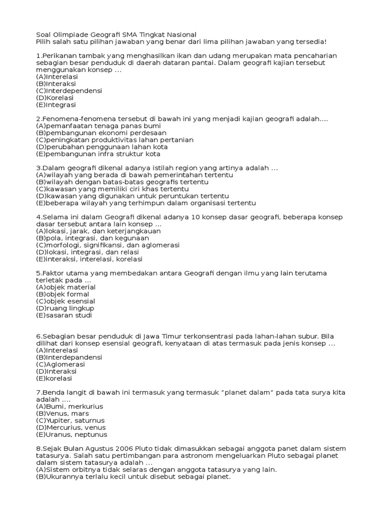 Soal Olimpiade Geografi Sma Tingkat Nasional Di Unesa Tahap 2 Pdf from imgv2-1-f.scribdassets.com Bagi yang memerlukan contoh soal un geografi tahun lalu, berikut saya berikan file nya. Akhir pembelajaran semester satu seminggu lagi berakhir, proses pembelajaran selama 5 bulan akan diuji dalam bentuk ulangan akhir semester. Konsep, pendekatan, prinsip, aspek menjelaskan pemanfaatan sistem informasi geografi(sig) beban soal : Soal seleksi osn geografi tingkat p. Soal ujian seleksi calon peserta olimpiade sains nasional 2016 tingkat kabupaten/kota bagian a: Soal usbn geografi sma 2018. Seminggu waktu yang pendek tetapi. Soal osk biologi sma 2016.