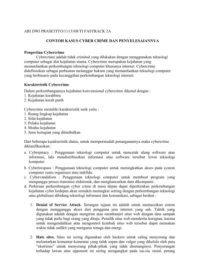 Jehatan yang terjadi dalam internet atau cyberspace yang demikian kompleks dan. Dengan beberapa contoh kasus cybercrime ini juga kita dapa mengetahui jenis dan baran bukti digital yang biasa di gunakan untuk kejahatan . Munculnya beberapa kasus cybercrime di indonesia,. Mengenai masalah cybercrime serta pentingnya mencegah kejahatan tersebut terjadi Penggunaan teknologi computer untuk membuat program yang menganggu proses transmisi elektronik, dan menghancurkan data dikomputer. Contoh kejahatan biasanya dengan menyebarkan virus komputer. Berikut merupakan ulasan lebih lengkap tentang pengertian cyber crime, contoh, serta jenis kejahatan cyber crime yang banyak ditemukan. Seiring dengan perkembangan teknologi internet, menyebabkan munculnya kejahatan yang disebut dengan cyber crime atau kejahatan melalui jaringan internet. Setidaknya terdapat dua contoh kasus. Serangan siber atau yang biasa disebut cyber crime merupakan kejahatan. Hal pengumpulan barang bukti, penggeledahan dan proses penyelesaiannya. Proses acquiring dan imaging, setelah penyidik menerima barang bukti digital, maka harus dilakukan proses acquiring dan imaging yaitu mengkopi (mengkloning/ .